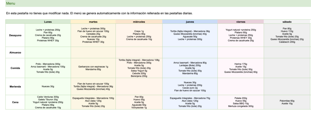 Al finalizar el menú sabrás todos los alimentos que necesitas y sus cantidades para cada semana.